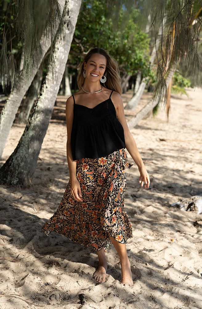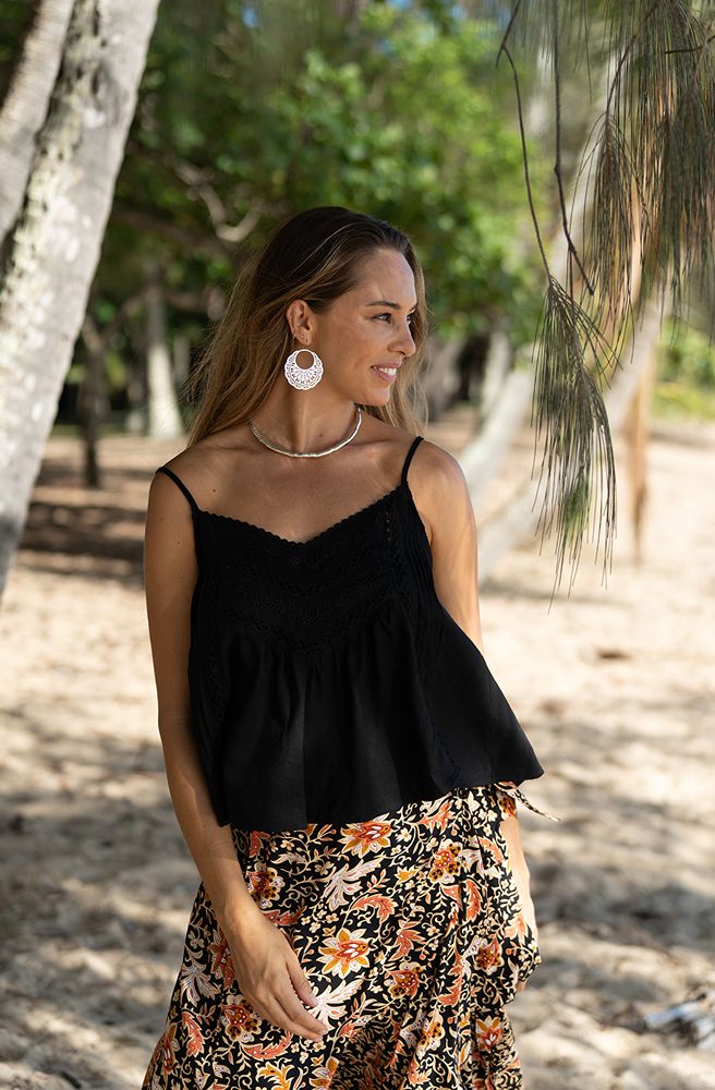 Your new wardrobe essential has arrived. The Ivy Lace Cami in Black is a feminine boho staple with a relaxed fit and beautiful lace detailing. Designed in a breathable linen/viscose blend, it feels soft on the skin, lightweight, and effortlessly chic from daytime wandering to balmy evening dinners.