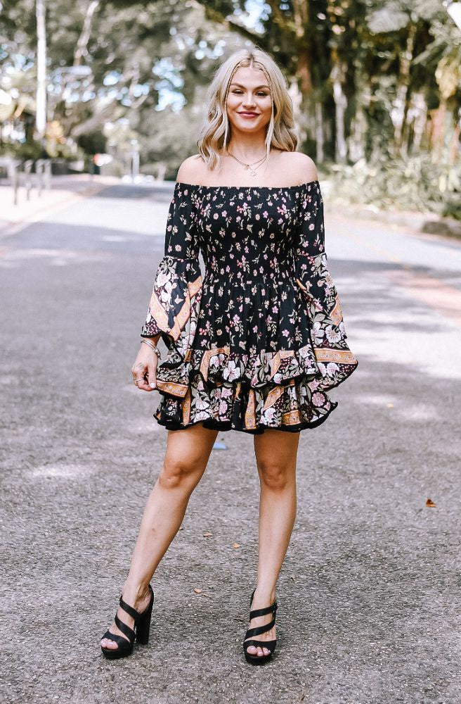 off the shoulder mini dress shirred bodice long sleeves ruffles