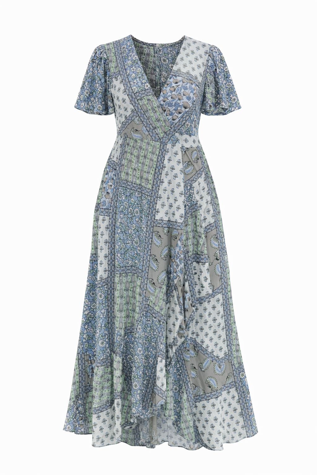 The Indigo Mosaic Nymph Wrap Dress blends soft femininity with effortless bohemian elegance. Designed in a beautiful patchwork-inspired print featuring shades of indigo, powder blue, sage, and ivory, this flowing maxi dress creates a striking yet wearable statement that transitions seamlessly from daytime outings to relaxed evening occasions.