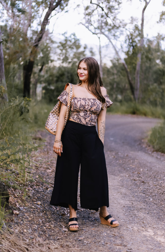 Get your boho vibes on point with our Drifter Pants in the ebony colourway! These pants are all about embracing that carefree, summer-loving style. Picture this: a deep midnight ebony shade, perfectly paired with side pockets and splits for that easy-breezy feel. They've got a fixed front waist and a stretchy elasticated back, plus two drawstrings at the side that let you cinch that waist for extra flair! These flared beauties are versatile—rock 'em with heels for a chic look or sandals for that relaxed vibe. Comfort? Check. You could totally pull these off at work and feel like a dream. The style almost looks a little like a skirt but isn't too bulky. In the shoots the Drifter Pants were paired with the Ebony Bandeau , the Black Paisley Lauren Top and the Phase Eclipse Tee in Charcoal. All our Honey Bunch range is made in small batches, in a small family run factory on the island of Bali. Our lovely tailors thank you all for helping them provide for their families by purchasing our lovely products.