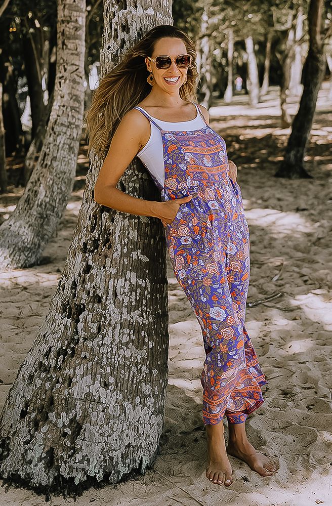 Passionate Transit Overalls, Purple and Orange Rose Print with Border Placement