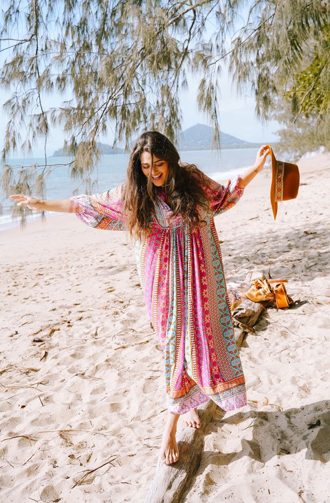 Floaty, feminine and effortlessly boho — the Boheme Midi Dress in the Cedella print by Jaase captures that carefree coastal spirit we all adore. With its relaxed silhouette, flattering V neckline and signature border detailing, this beauty is designed for those sunlit days, market wanders and holiday moments where you want to look put-together with zero effort. The vibrant Cedella print blends joyful pink, teal and mandarin tones to create a bold yet whimsical boho statement that feels instantly uplifting.