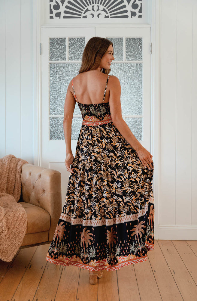 Effortlessly striking and beautifully detailed, the Jaase Jardin Bambi Maxi Dress is a true statement piece. Featuring a rich black base with warm caramel, soft sage and earthy botanical tones, this flowing maxi captures the essence of bohemian elegance while remaining easy to wear.