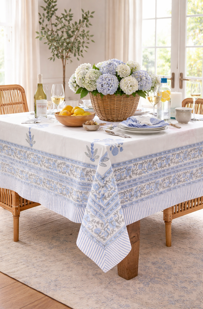 Bring fresh coastal elegance to your dining space with our Tablecloth Blockprint Hamptons. Handcrafted from 100% cotton using traditional block-printing techniques, this design features soft blue botanical motifs, intricate floral borders, and delicate striped edging that create a timeless Hamptons-inspired aesthetic.